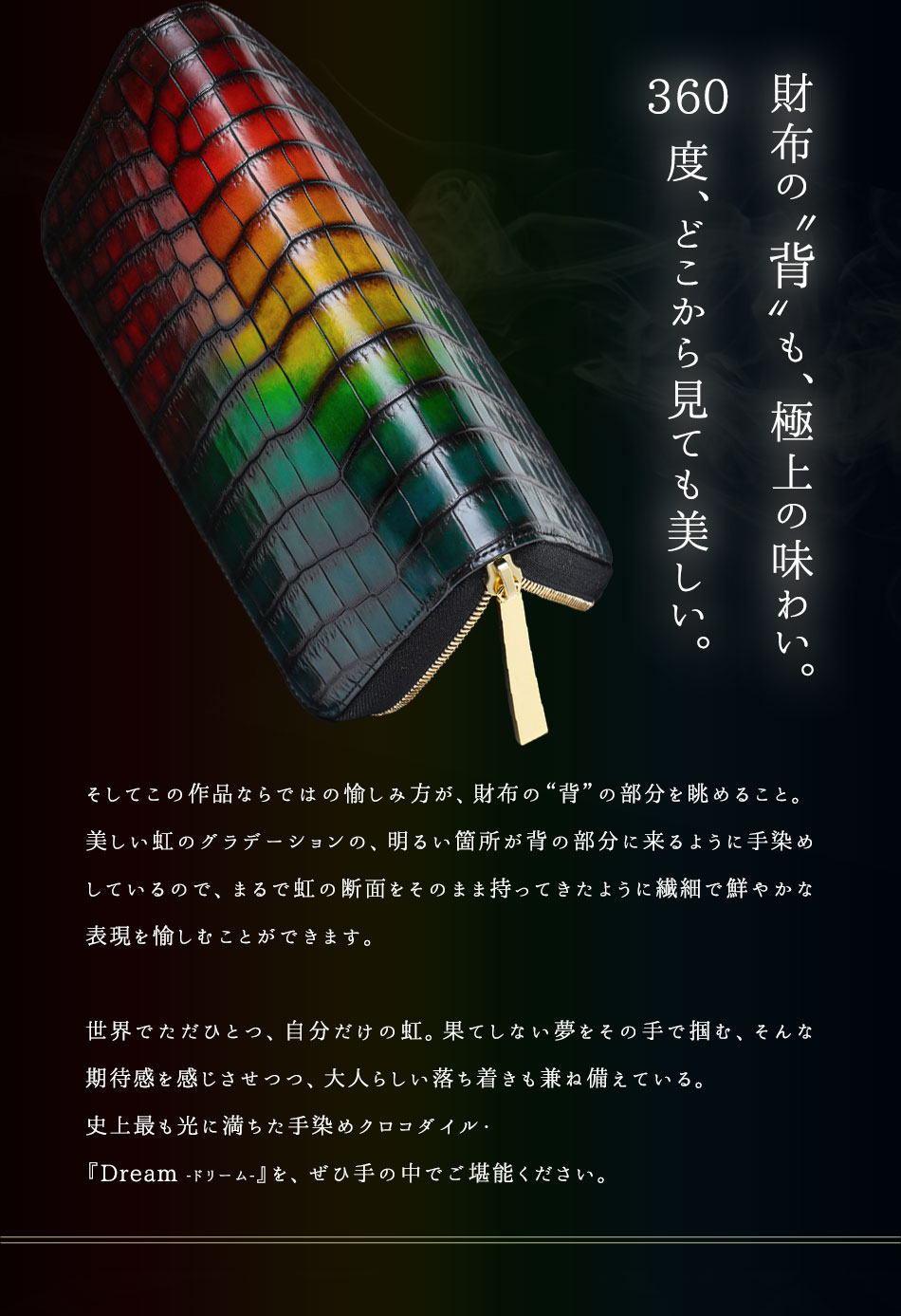 《 数本限定作品 》 “彩飾グラデーション”クロコダイル一枚革財布「Dream」 ただいま【 数本限定オーダー会 】を開催しております こちらの作品は、史上最高傑作の透明感を叶えた「彩飾クロコダイル」の一枚革財布。 一部の限られた職人のみが製作できる特別作品であり、一時完売となっておりましたが ただいま数本限定にてオーダーを受付中です。 *今回受付できる分が完売となりますと、オーダー会は予告なく終了させていただきますので ご興味のある方は、ぜひこの機会にご覧くださいませ。 |